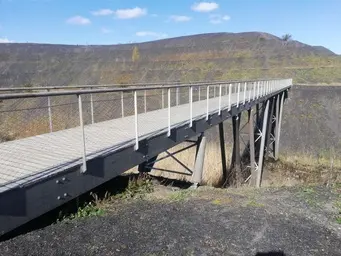 Entièrement réalisée en métal, cette passerelle offre une structure à la fois légère, résistante et adaptée aux longues portées. Sa conception sobre et moderne convient parfaitement aux zones industrielles, aux milieux naturels techniques ou aux sites nécessitant un entretien minimal. Elle garantit sécurité et pérennité, tout en permettant une intégration discrète dans l’environnement. Le garde-corps en câble ou filet métallique assure une transparence visuelle optimale. Cette solution est idéale pour les franchissements importants ou les zones à fort passage.