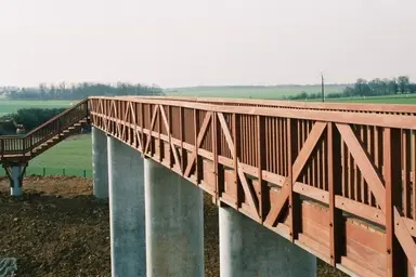 Cette passerelle en bois allie robustesse, durabilité et esthétique naturelle. Conçue sur mesure, elle s’intègre parfaitement dans les environnements paysagers, forestiers ou ruraux. Grâce au bois lamellé-collé, elle permet de franchir de longues portées tout en garantissant stabilité et élégance. Le garde-corps assorti en bois renforce l’harmonie visuelle de l’ensemble. Idéale pour les collectivités, parcs ou sentiers piétons, cette passerelle met en valeur le savoir-faire artisanal et la qualité des ouvrages bois.